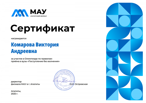 Главная » Абитуриенту » Профориентационные мероприятия » Олимпиада по правилам приема в вузы “Поступление без волнения» » Итоги регионального этапа Олимпиады по правилам приема в вузы «Поступление без волнения» в 2025 » Комарова Виктория Андреевна