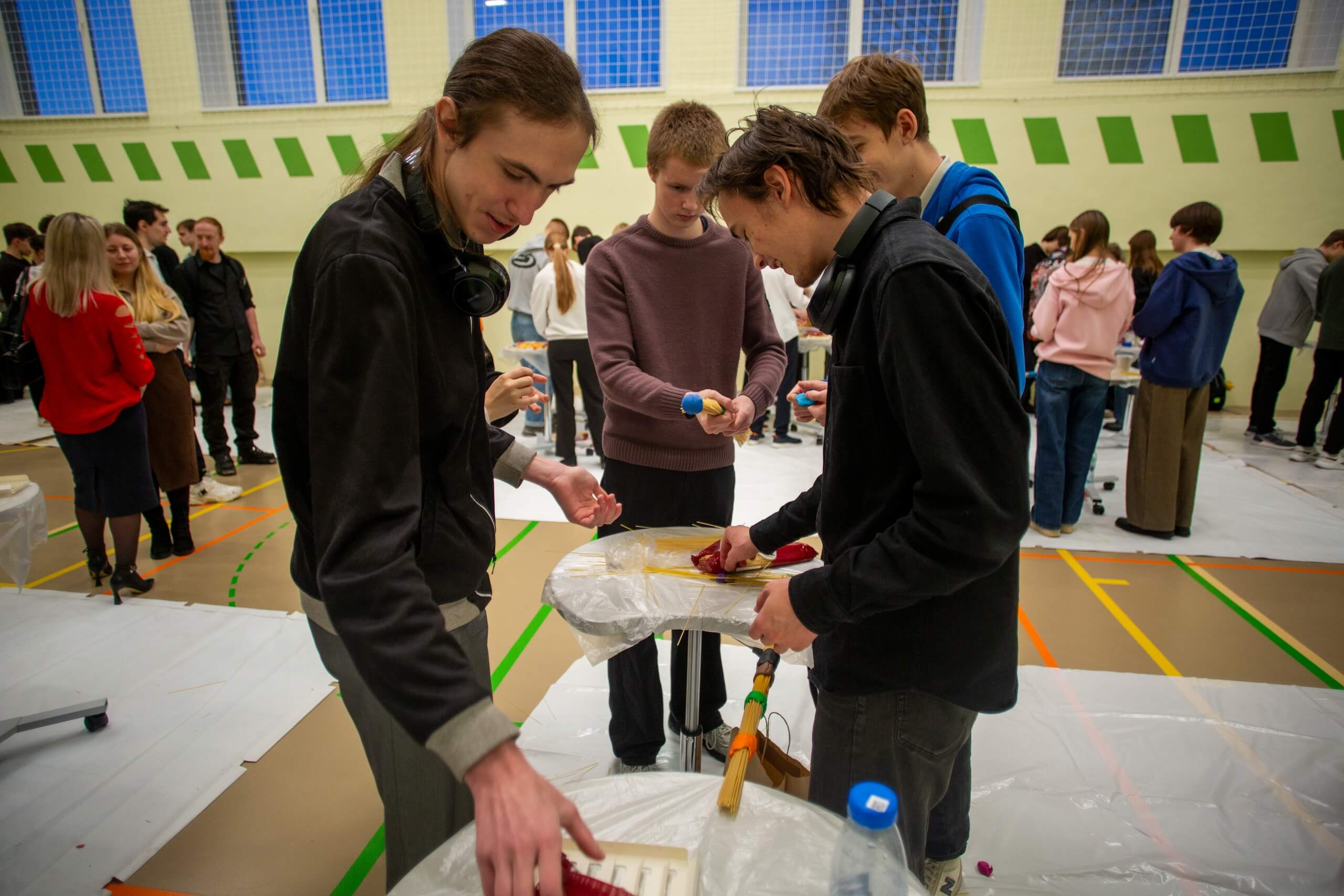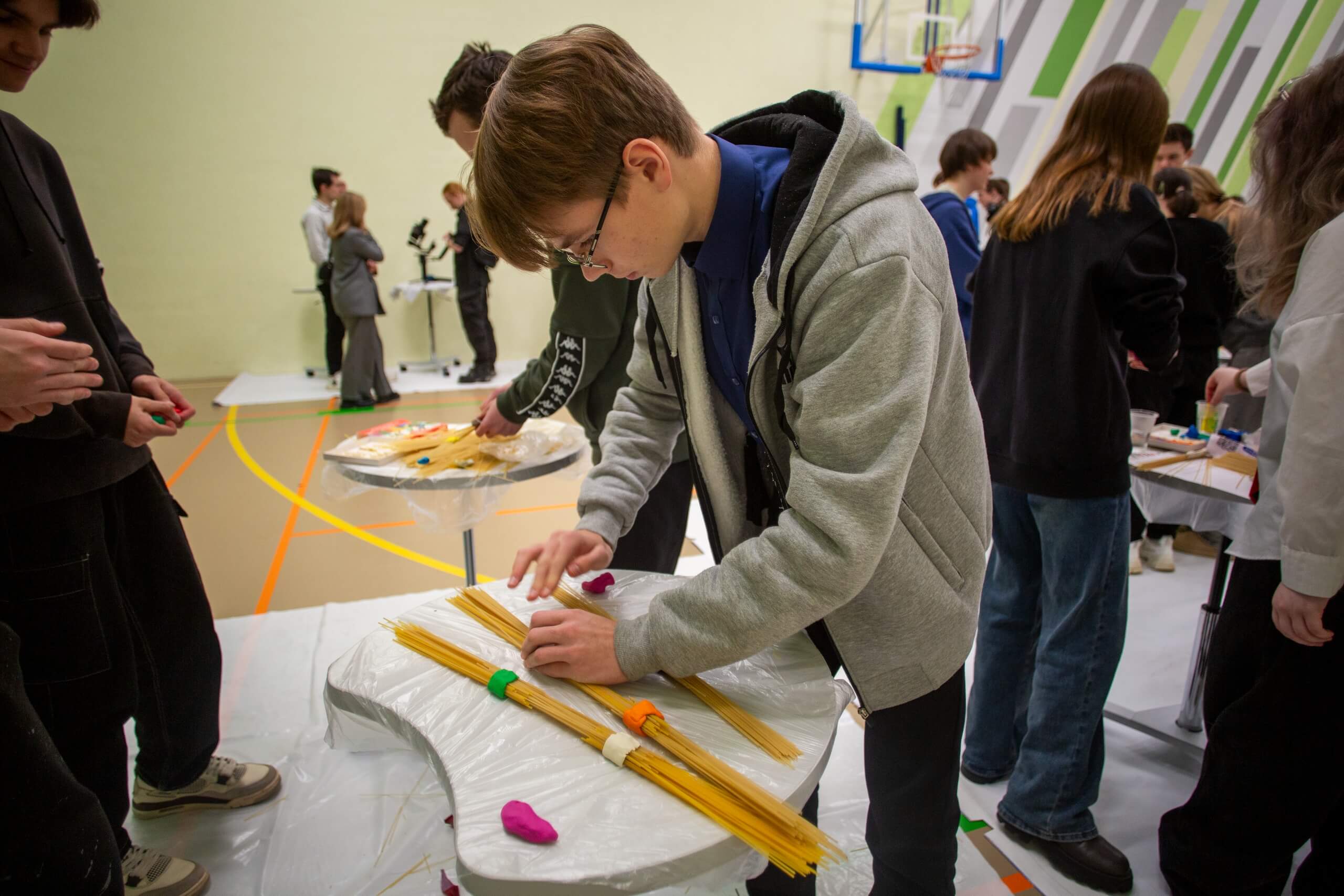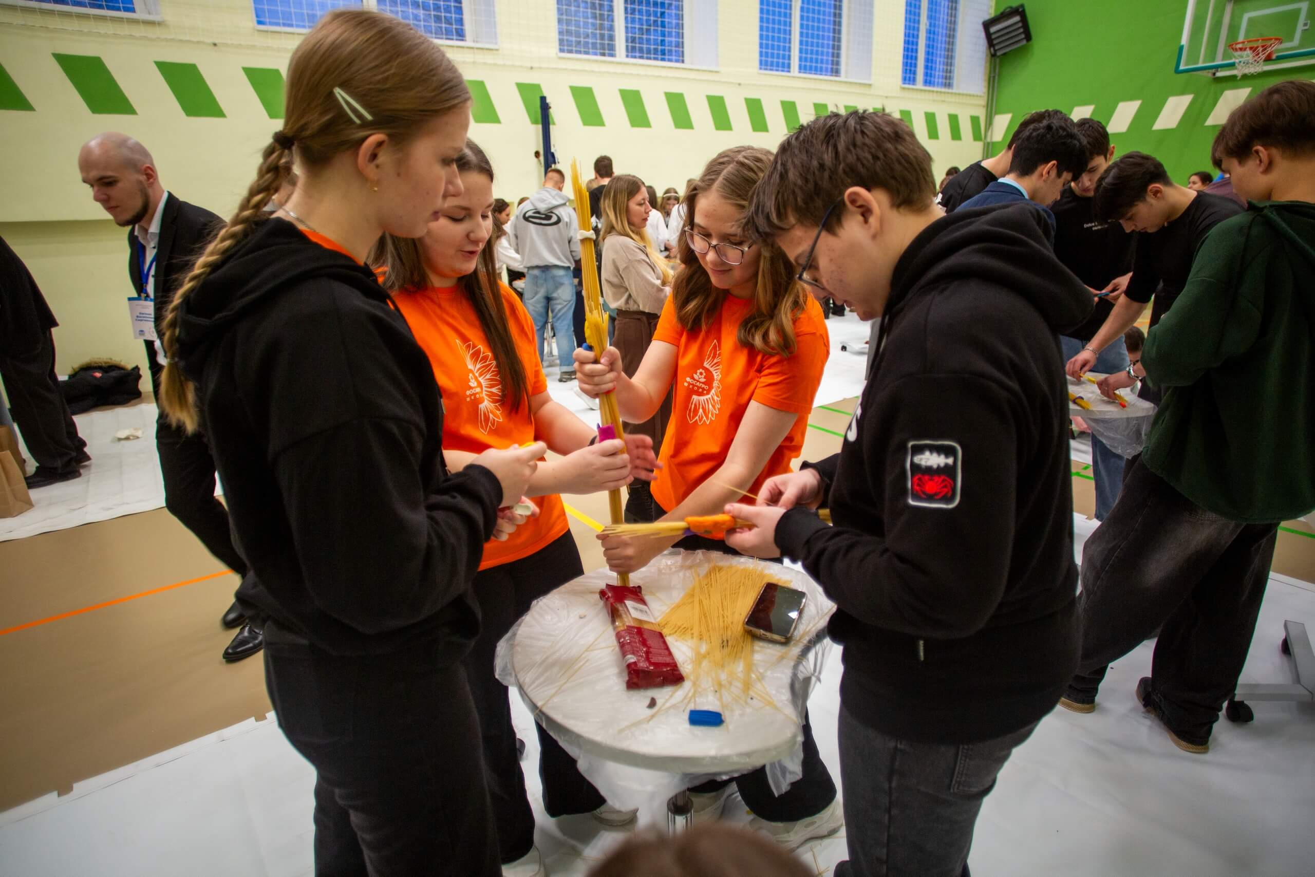 2. После этого участники турнира объединились в команды, чтобы принять участие в Генеральном сражении — строительстве мостов из макарон. Каждая команда создавала мосты из спагетти и пластилина. Задача — не просто красота, а максимальная прочность. Именно здесь решалось, чья конструкция выдержит историческую нагрузку, а чья — треснет под давлением обстоятельств.